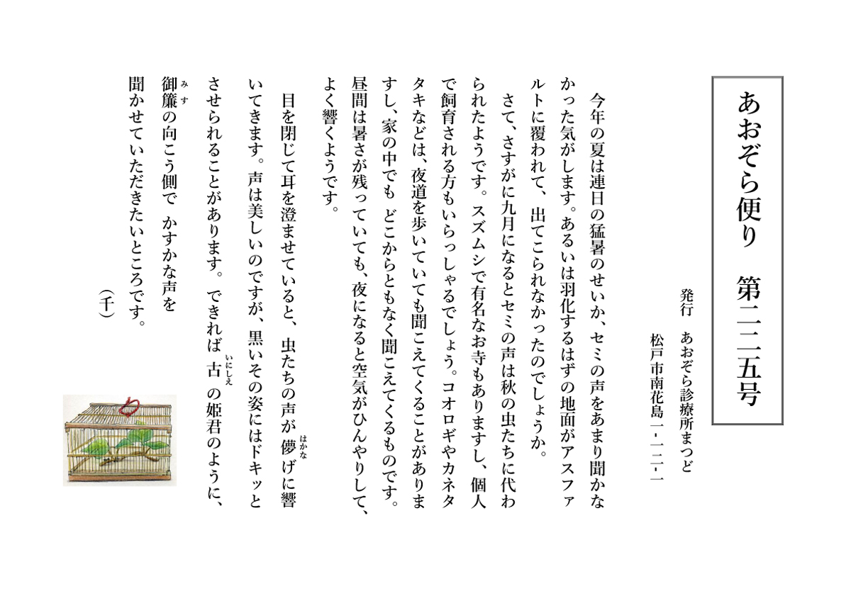 あおぞら便り 在宅でお過ごしの患者様・ご家族様に、季節の香りをお届けします。 あおぞら便り225号 あおぞら便り224号 あおぞら便り223号 あおぞら便り222号 あおぞら便り221号 あおぞら便り220号 « 前のページ ページ1 ページ2 ページ3 ページ4 ページ5 次のページ »