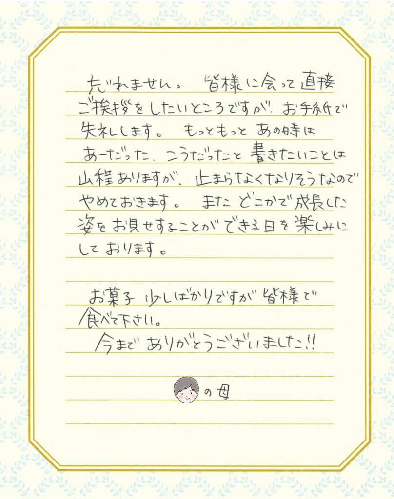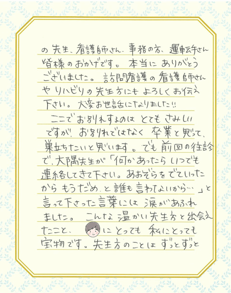 はるたか会の訪問診療をご利用の患者様・ご家族様の声をご紹介します。長年、訪問診療を受けられ、卒業された患者様とそのお母様から、お手紙をいただきました。