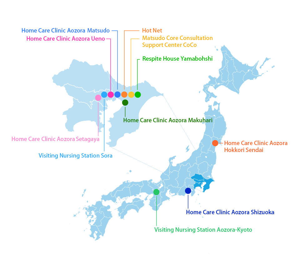 In 1999, we started a clinic in Matsudo, a city close to Capital Tokyo, to provide a home-visit service. Since then, we have opened six clinics, two home-visit nursing stations, and two welfare facilities that provide social and medical services to support people with disabilities and severe ill persons. We now provide community support to about 1,900 patients of age 0 to 100.